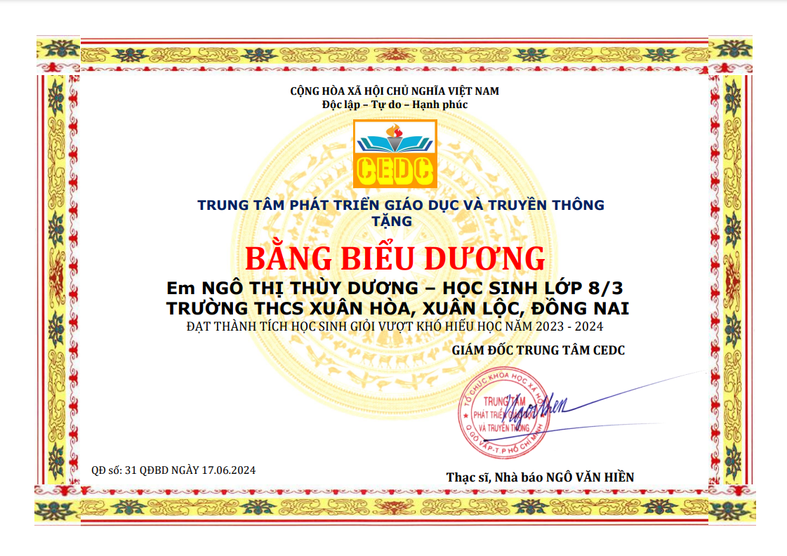 18 Tháng Sáu, 2024Nhân dịp kỷ niệm Ngày Báo chí Cách mạng Việt Nam 21/6/2024, ngày 17/6/2024 Giám đốc Trung tâm CEDC đã ký Quyết định số 30 & 31 về việc khen thưởng 2 em học sinh giỏi, xuất sắc vượt khó...