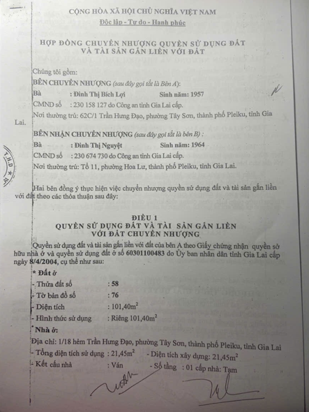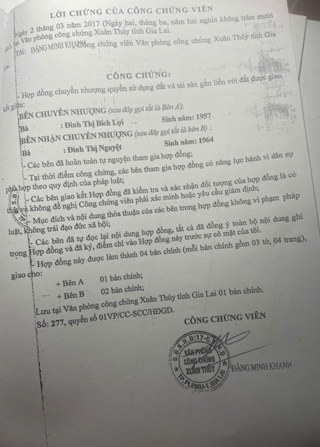 Ngày 02/03/2017, bà Đinh Thị Bích Lợi – SN 1957, thường trú 62C/1 Trần Hưng Đạo, phường Tây Sơn, thành phố Pleiku, tỉnh Gia Lai (cũ); và bà Đinh Thị Nguyệt – SN 1964, thường trú tổ 11, phường Hoa Lư, thành phố Pleiku, tỉnh Gia Lai (cũ) ký Hợp đồng chuyển nhượng quyền sử dụng đất và tài sản gắn liền với đất.